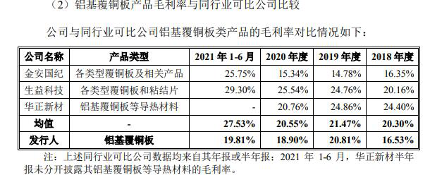 2018-2021上半年,逸豪新材铝基覆铜板类产品的毛利率分别为16.53%、20.81%、18.9%、19.81%,同行业可比公司该产品毛利率均值分别为20.3%、21.47%、20.55%、27.53%,铝基覆铜板类产品的毛利率整体上升了,但一直低于同行业可比公司。