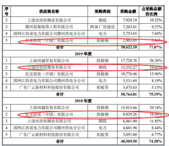 2018-2021上半年,逸豪新材供应商较为集中,前五大供应商采购占比分别为 74.28%、 75.19%、77.87%和 67.23%。报告期内公司向前五大供应商的采购主要为铜、铝 板和电力,原材料铜、铝为大宗商品。值得一提的是由于逸豪新材拖欠款项损失托克投资重要供应商,其中2018年和2019年托克投资供应占比18.04%和15.96%,由于逸豪新材拖欠货款等原因2020 年 5 月起托克投资与发行人终止合作。托克投资是全球最大的金属贸易商。