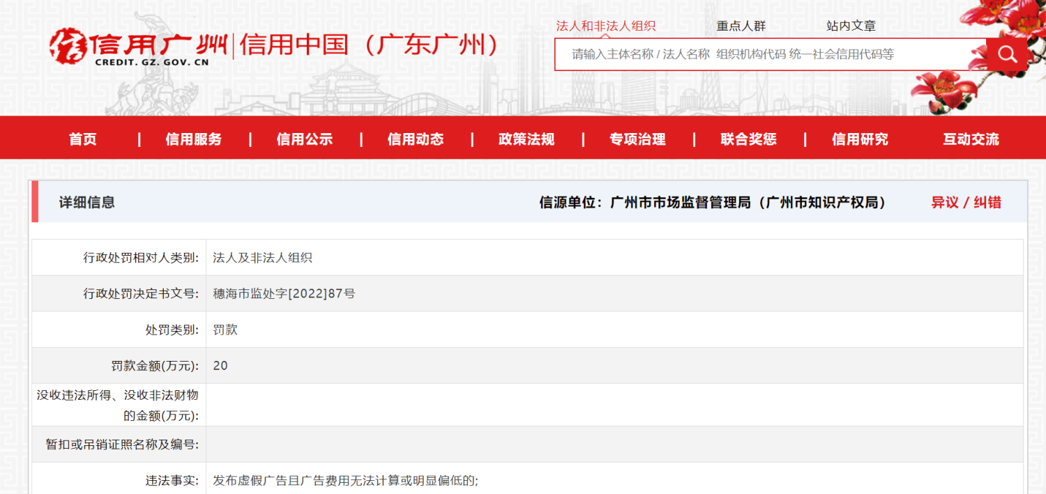 据广州市场监督管理行政处罚信息公示平台信息显示,行政处罚决定书中并未完整披露具体处罚措施。但在信用广州中,记者查到,处罚金额为20万元。
