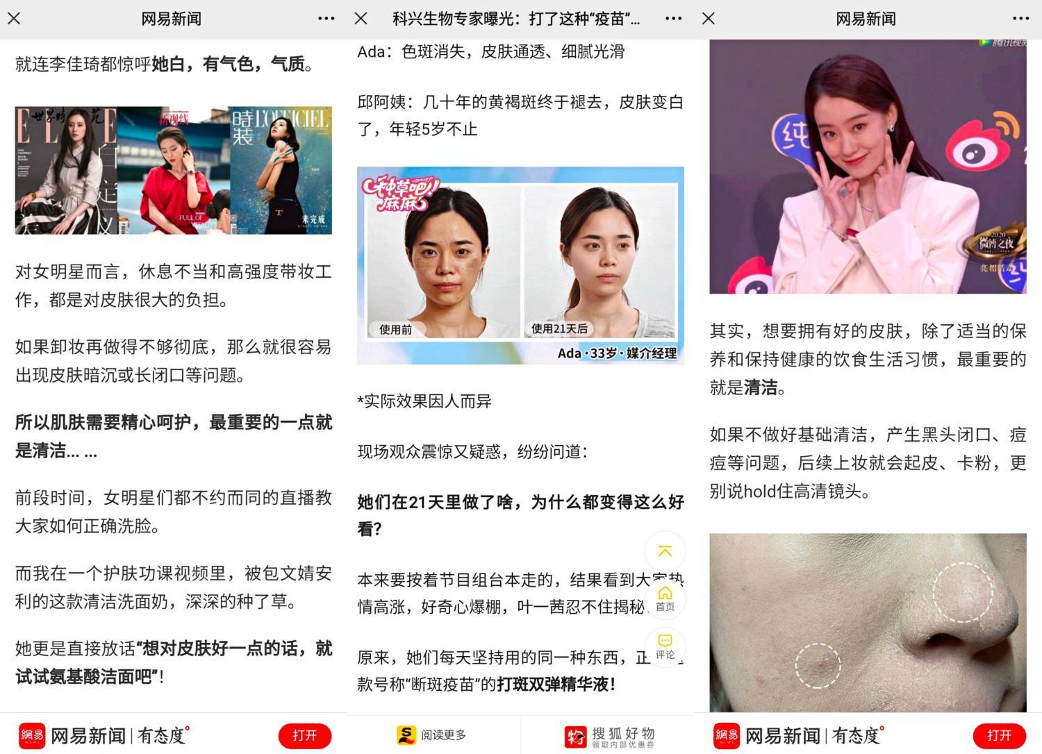 《票房超50亿!都说“红气养人”?张小斐这脸也太吓人!》一文,则以女明星张小斐的八卦为噱头,实际宣传清洁泥膜产品。
