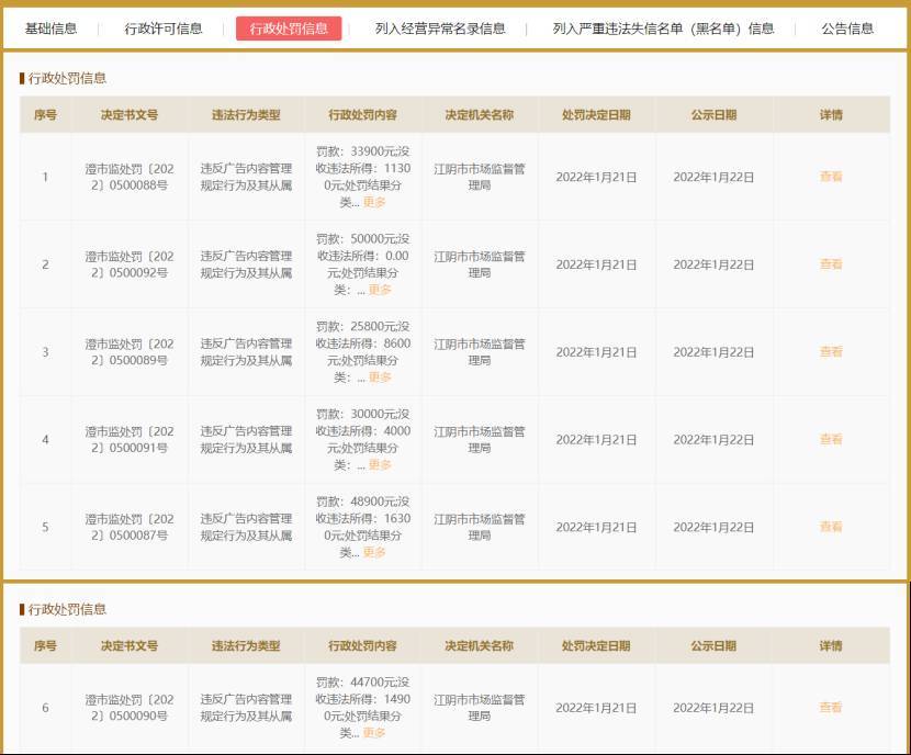 据国家企业信用信息公示系统显示,仅在2022年1月22日一天内,该公司的行政处罚决定就多达6条,罚款共计23.33万元,没收违法所得5.5万元。