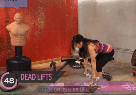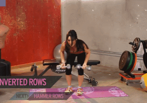 屈膝,手拿哑铃曲臂向上提拉至胸部,腰背平直,头部保持自然状态。(三组,每组 15 下,组间休息 25 秒)