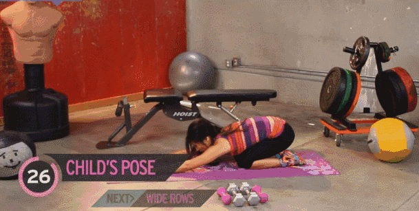 所有动作做完后,来一组背部拉伸,放松紧张的背部肌肉,坚持40s。