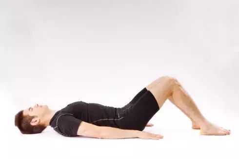 仰卧屈膝,双脚与肩同宽,双膝微微分开,双手自然放在身体两侧;将盆骨朝正上方提起,放下;将骨盆向下拉,返回原位;将左边盆骨朝左上方微微提起,放下;将右边盆骨朝右上方微微提起,放下。