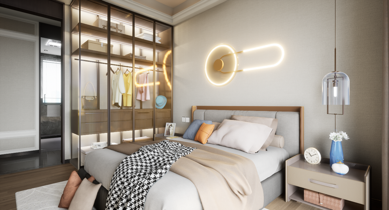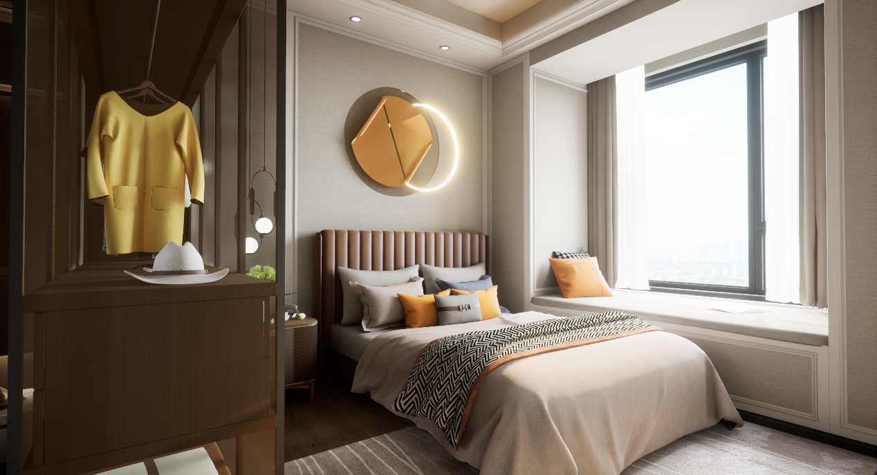 再往里,就是私密的主卧,主卧与其他房间相比,在设计精神上应该体现出独立性。因为从空间上面积上看,应该尽可能地满足简单的工作、梳妆、卫生间、上网等众多功能,使主卧能让人除睡眠外长时间驻留。该户型主卧大尺寸套房设计,配备独立卫生间,充分提高入住的舒适度,而且主卧的开间宽敞,整个房间设计显得舒适、大方、温馨,后期可打造L型超大衣帽间,彰显生活品质。