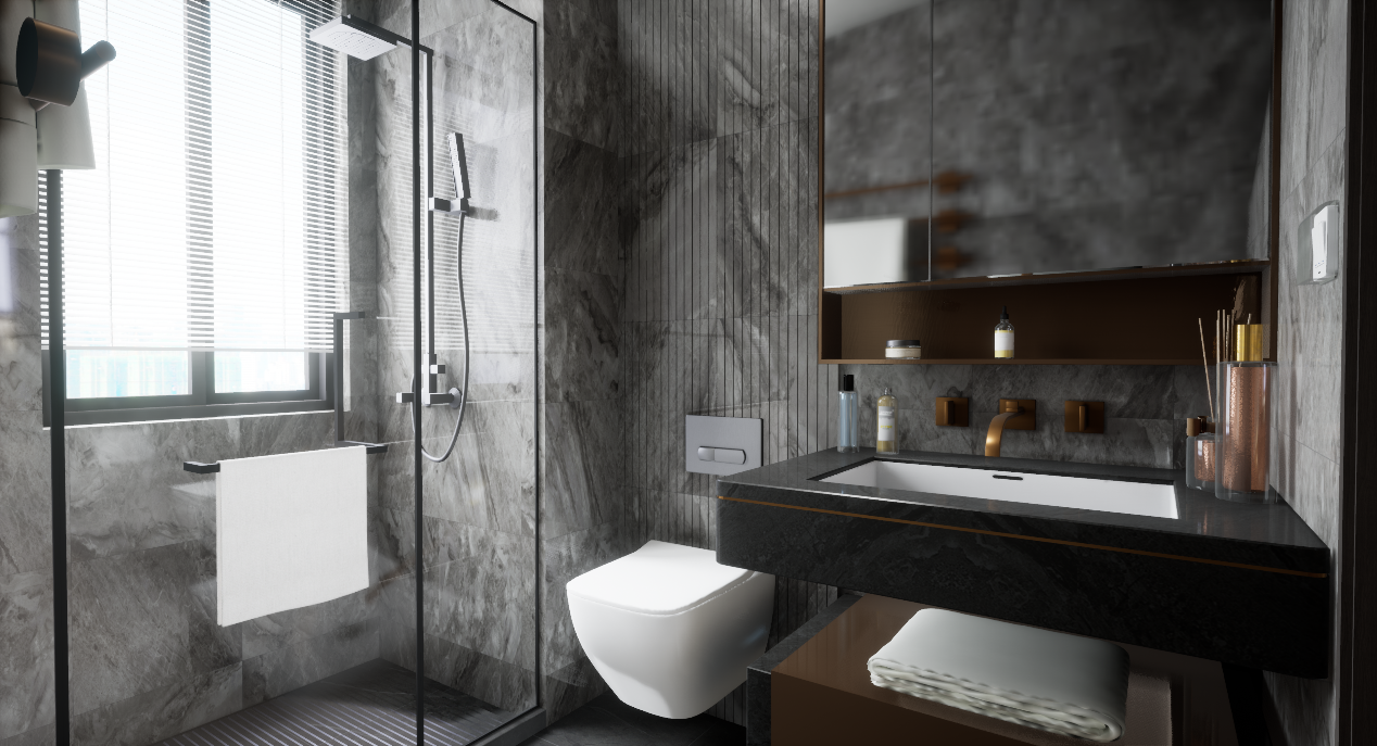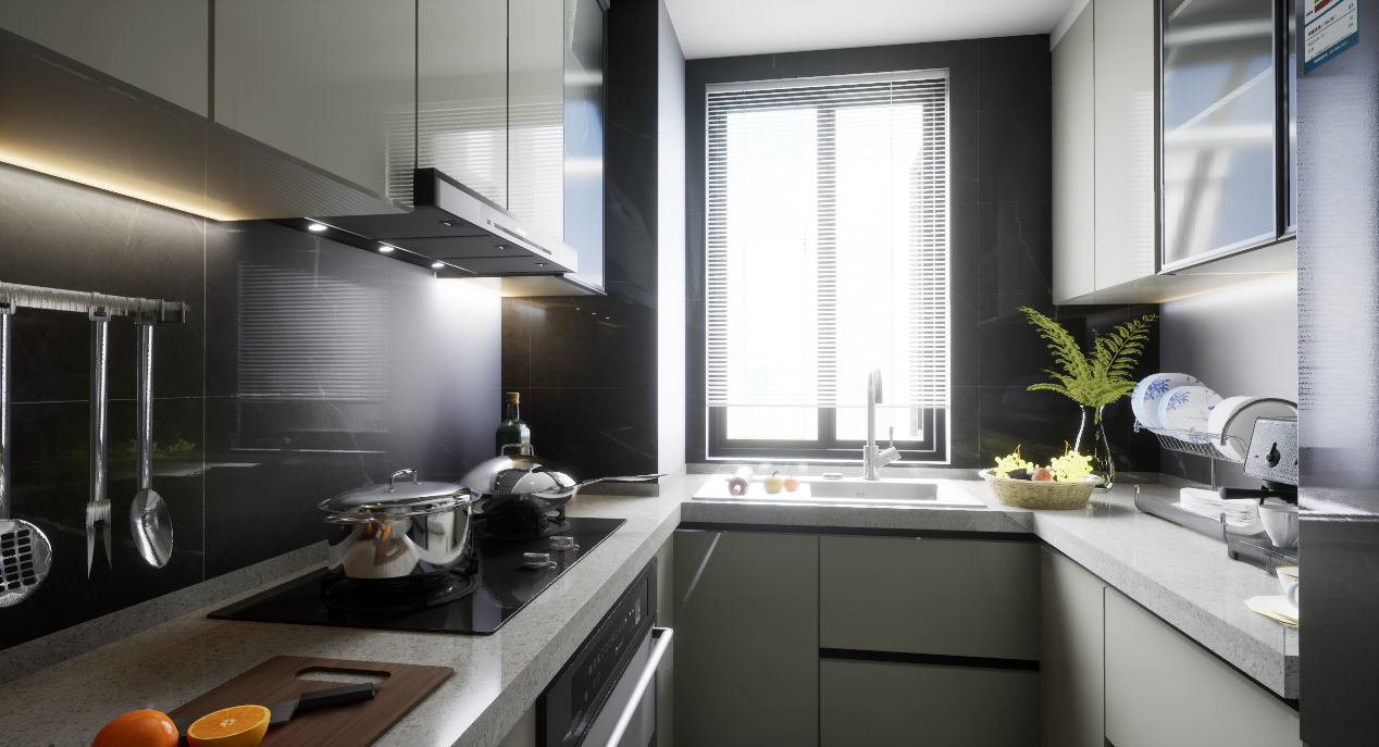 入户左手边为厨房,厨房设计采用U型布局,高效利用空间,非常人性化。黄金三角位,使得您在厨房只需小幅转身和移动,就可轻松顺畅的完成整个“洗、切、炒,煮”操作流线,高效烹饪尽享品质。厨房预留了双开门冰箱位置,每天买菜回到家,开门就能把手上菜品放到冰箱,既方便快捷又不会出现令人头疼的卫生问题。另外,厨房的开窗位置设计非常合理,既满足采光通风,又没西晒烦恼。