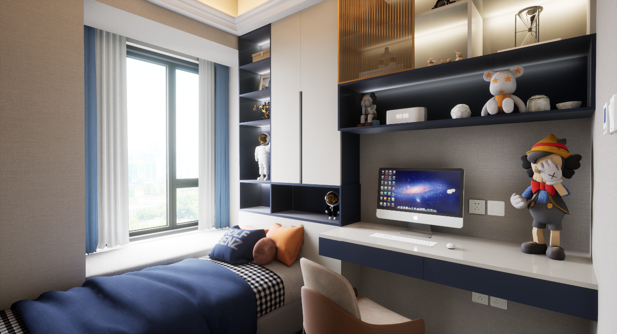 另一北向卧室若家庭成员不多则可设计成书房,书香墨宝打造成一个洗涤心灵之处;或者设计成儿童房也未尝不可,用暖色调的壁纸给孩子创造一个娱乐天地,都是很棒的处理。