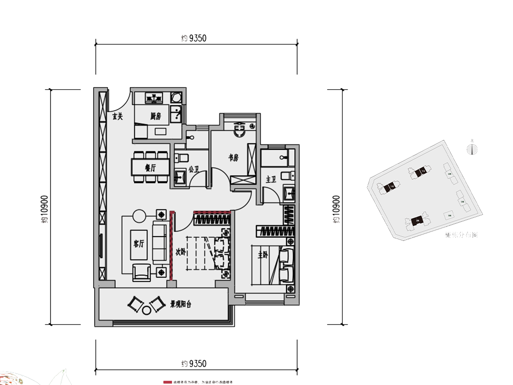 建面约95㎡,为2房2厅2卫交付,但交付后,业主可根据需要改造为2+1户型。