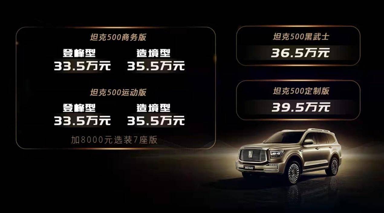 3月18日,备受期待的坦克500正式上市,共推出商务版、运动版、定制版、黑武士4个版本6款车型,售价区间为33.5万-39.5万元。针对订购用户,坦克品牌还现场推出了惊喜4重礼,以及6项福利政策。