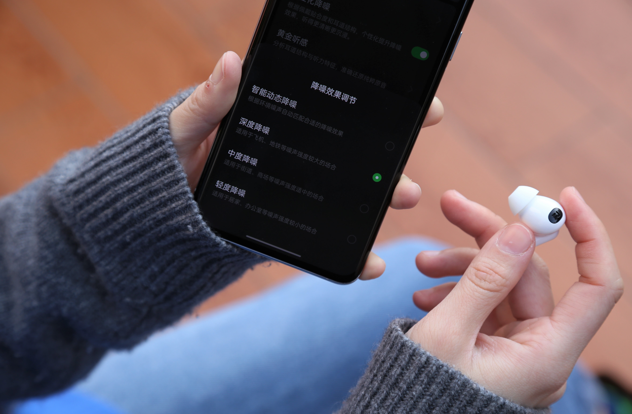 这次OPPO Enco X2另一大提升就是降噪体验,相比于前代产品,它的主动降噪深度从35dB提升到45dB,有效降噪频宽也从2kHz提升到4kHz,同时增加了个性化降噪和智能动态降噪的使用功能。我们分别测试了一下OPPO Enco X2在公交、地铁场景下降噪表现,对诸如汽车发动机轰鸣声这样的低频噪声控制做得还是很不错的,而且可以选择智能动态降噪模式,省去自己频繁切换模式的麻烦,智能的根据所处环境的外界噪音情况,动态调节降噪模式。