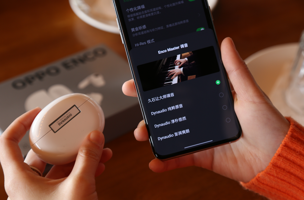 整体的音乐体验下来,OPPO Enco X2的低频部分表现非常出色,超出了预期。鼓声部分的下潜有深度,回弹有力度,而且非常干脆利落,完全不拖泥带水,“咚咚”声直击心底。人声部分的声音则表现的非常醇厚,有种人声娓娓道来的感觉。最让惊喜的是这次升级的OPPO Enco X2的音效增加到Dynaudio纯粹原音、Dynaudio淳朴悠然、Dynaudio澎湃爽朗和久石让大师调音4种。最突出的自然是久石让大师调音,让整体音乐更倾向于原音还原和临场感,更倾向于原音还原和临场感。再加上这次全新升级的杜比全景声的声效和黄金听感的个性化贴合,俨然一副真无线蓝牙耳机天花板产品姿态。