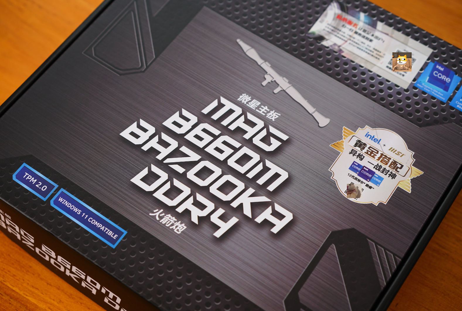 微星B660M BAZOOKA火箭炮的外包装没什么好说的,一如既往的硬核风,除了火箭炮的中英文标识,甚至还有图案。当然这玩意大家都习惯说成是RPG或者是40毫米火箭筒(简称40火)。我在服役的时候只摸过,但没发射过。