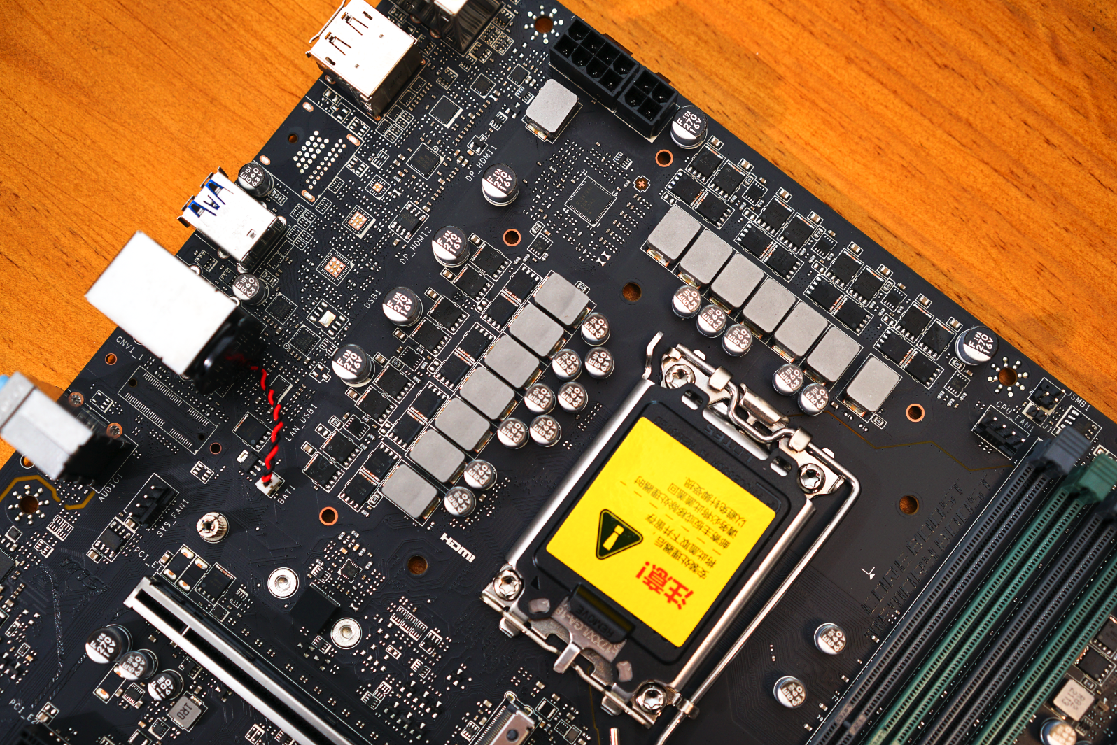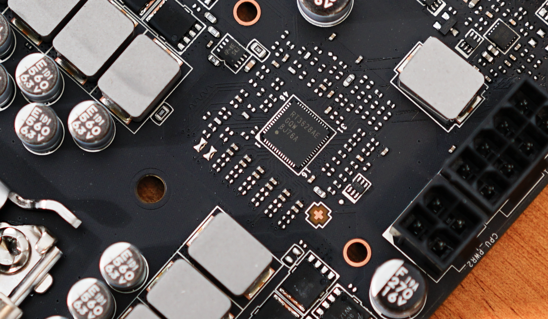 仔细看看供电部分的细节,PWM芯片是常见的立锜RT3628AE,在一些Z690、B660上都有使用,最大支持8+1项供电。也就是说在微星B660M BAZOOKA火箭炮上,是通过并联式的供电,也就是说供电就是1(核芯显卡/每相1电感+3个MOS)+6(CPU核心/每相2个电感+4个MOS)共7相,这样的设计不仅可以增强供电电流,同时降低整体电感的供电温度。