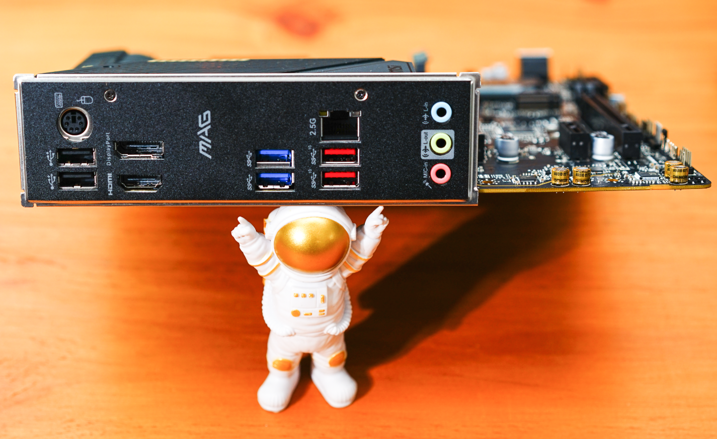 I/O接口方面,微星B660M BAZOOKA火箭炮比较简单,从上到下分别是键盘/鼠标PS2、2个USB 2.0、DP、HDMI、2.5G网卡、2个USB 3.2 Gen 1 5Gbps、2个USB 3.2 Gen 2 10Gbps以及音频接口。满足绝大多数用户的使用没有太大问题。