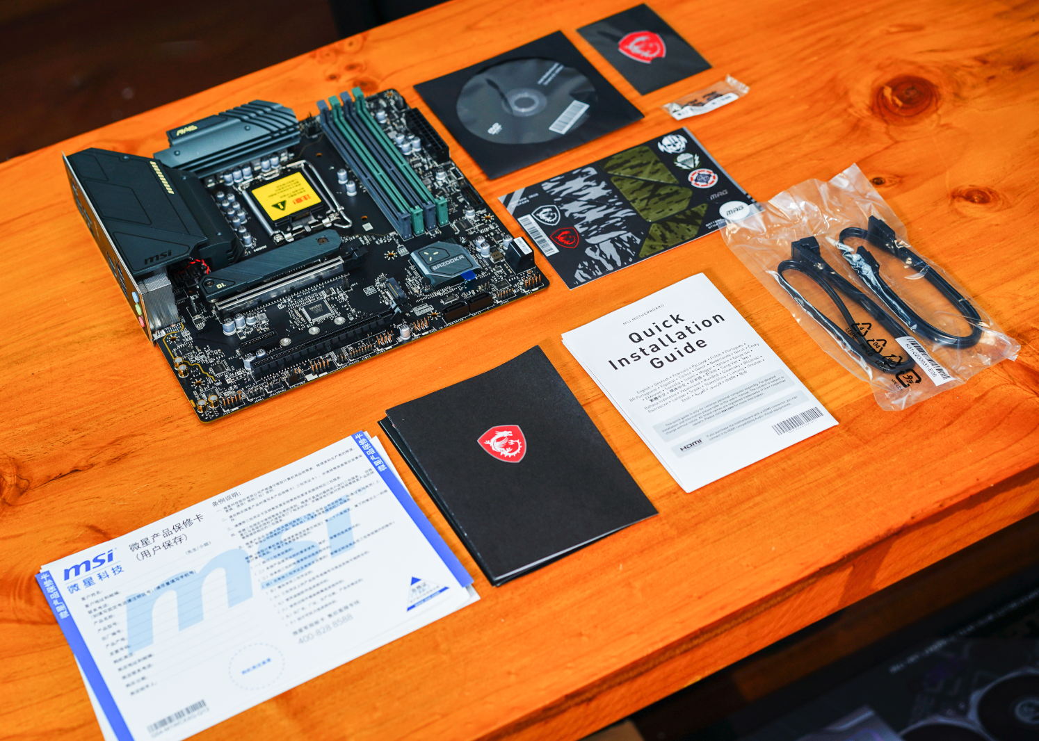 开箱全家福,比起高端系列,微星B660M BAZOOKA火箭炮驱动还是用光盘,也没有配送小螺丝刀,不过宣传小卡片还有贴纸都没有落下。附件还有SATA数据线和M.2固态用的铜柱+螺丝。
