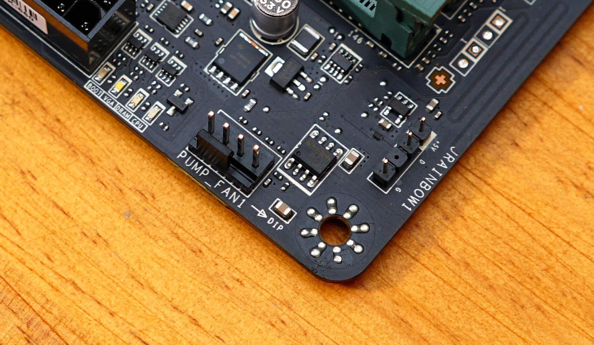 PUMP_FAN1是水冷头接口,可以输出更大的电流,为水泵提供更强劲、稳定的动力。上方还有一个5V的RGB同步接口。