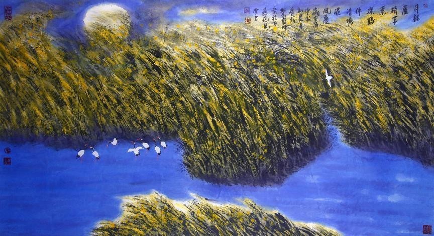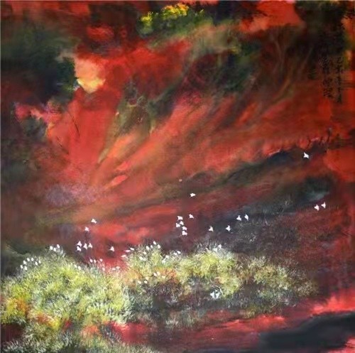 作品以其质朴、自然、粗犷表现大自然内蕴的力量,画面寻求强烈的张力及律动的音符,对东西方的透视及色彩的节奏,在中国画的以墨为主的画面中泼墨泼彩,寻求画面三象归一的构架(具象、意象、抽象),用色彩的色阶变化和墨色的互渗互化,在画面中巧妙结合,使作品更贴近大自然,更具有画面的视觉冲击力,和画面内容的反思,把传统与现代巧妙地融合起来,在现代彩墨画的追求中,逐步形成了现代山水画的表现风格。