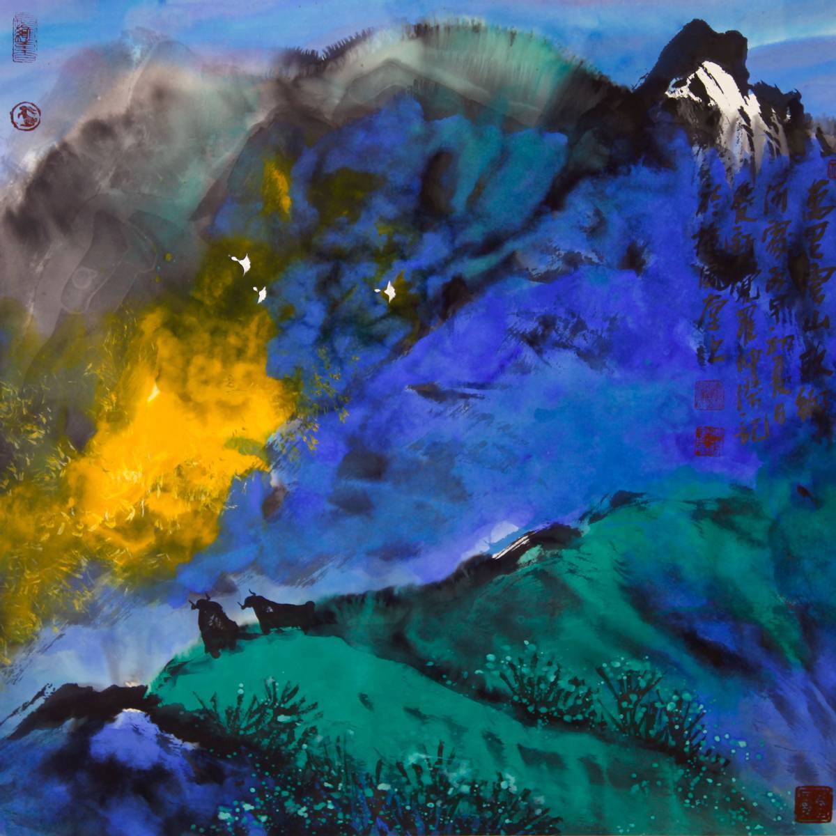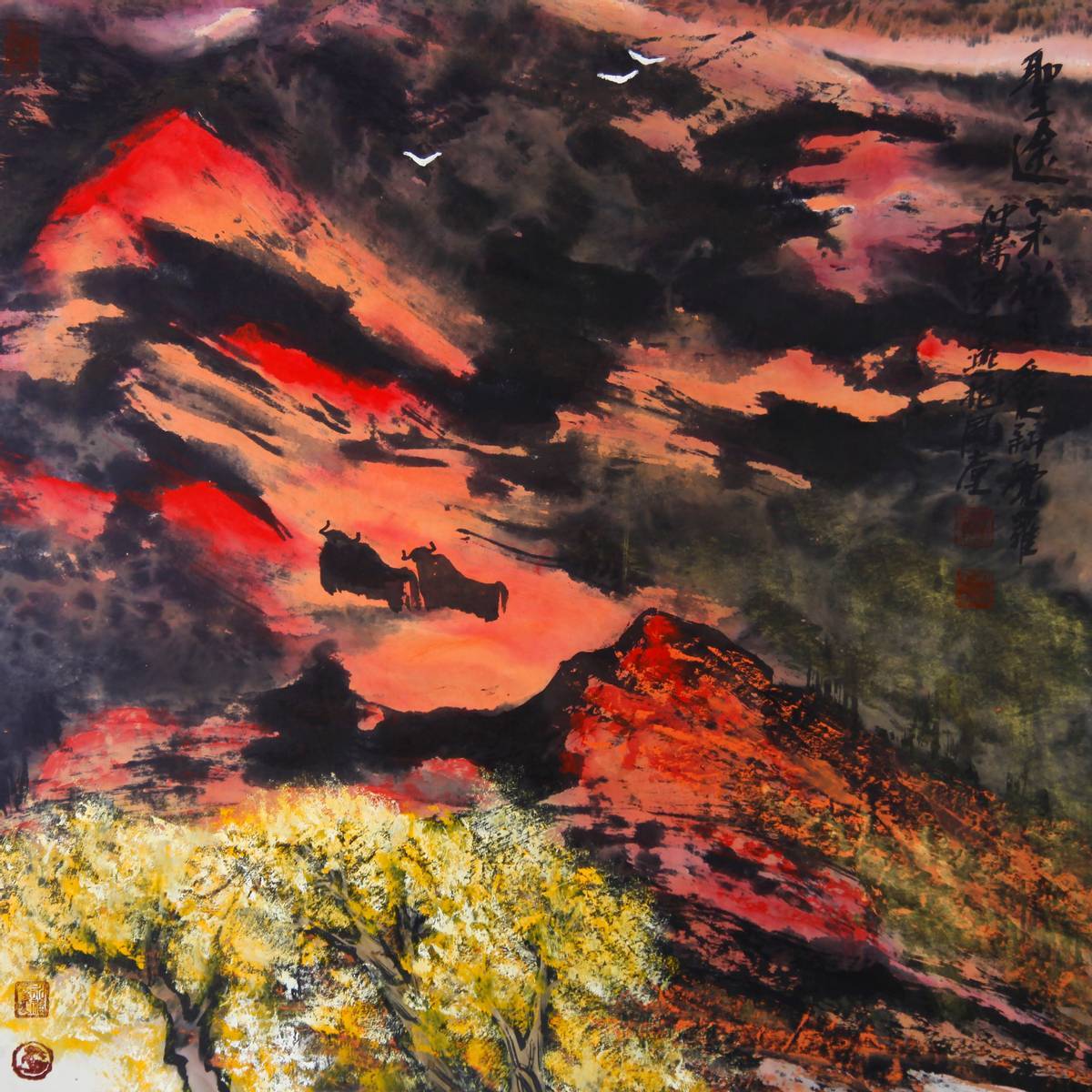 于尺幅之间,展现山水壮势,这种难度可想而知,若没有很高的造诣,恐难为之,而这也正是山水画的魅力所在。赵仲杰的山水巧妙地运用了笔墨的技法和画面的构图,达到了山水展于尺寸的创作境界。笔墨前面已作见解,单论构图,他在画中为观者描绘了三层的景观,其一是近景,树木山水,牛羊首目便映入眼帘。其二是中景,泼墨重彩,宏大山体,于此时观者已然入景。其三便是群山绵延千里,候鸟渐行渐远,为画面提供了似点睛一般的精髓美。写意坚岩,满山松风,赵仲杰所创作的这一幅幅宁静的山水世界,令人神往,令人安宁。