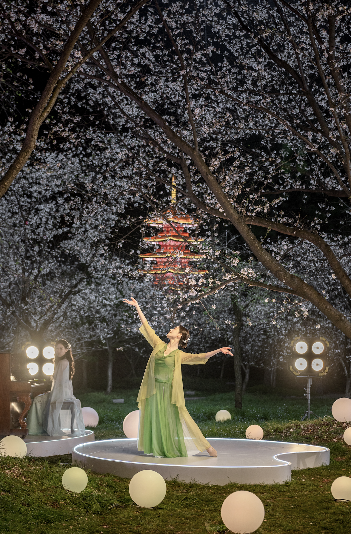 直播中,樱花树下的国风音乐会吸引了全国观众的目光。月色中,夜樱下,B站人气国风UP主墨韵、青年笛箫演奏家孟晓洁以及武汉本土新民乐乐团On Show Art等用古筝、笛子等乐器表演民乐《洵兮》《英雄之城》《醉花间》《青水之祈》;武汉歌舞剧院舞蹈演员郑欣子伴着夜风在樱花下起舞,将樱花盛放感推向高潮,给全国观众带来一场精彩的视听盛宴。
