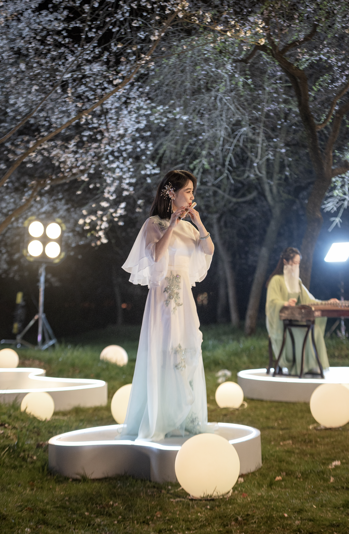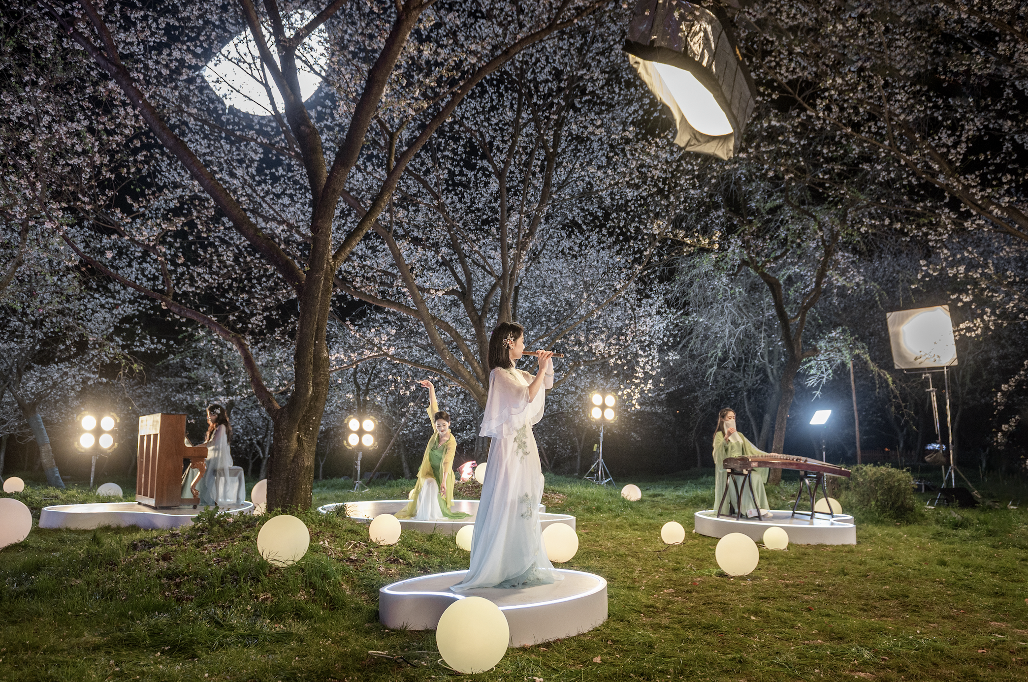 3月20日晚,人民日报、新华社、央视新闻及长江日报等近40家直播平台联合开启直播,一场赏樱慢直播上演。图为武汉樱园樱花树下的国风音乐会现场。通讯员武文旅供图