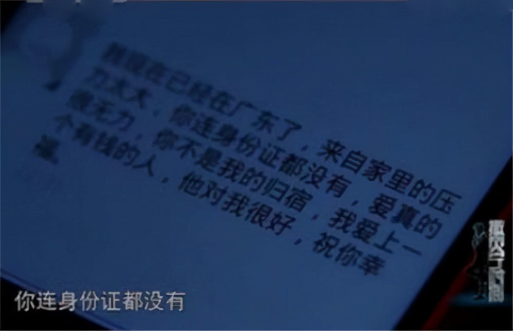 虽然杨长进有了吕秀燕失踪前不在场的证明,但警方还是在一个细节上看出了破绽。根据吕秀燕曾发给杨长进的短信进行分析,其中有一句“你连身份证都没有”,这令警方颇为关注。如果一个在外打工的人没有身份证,那么大概率是负案在逃人员。
