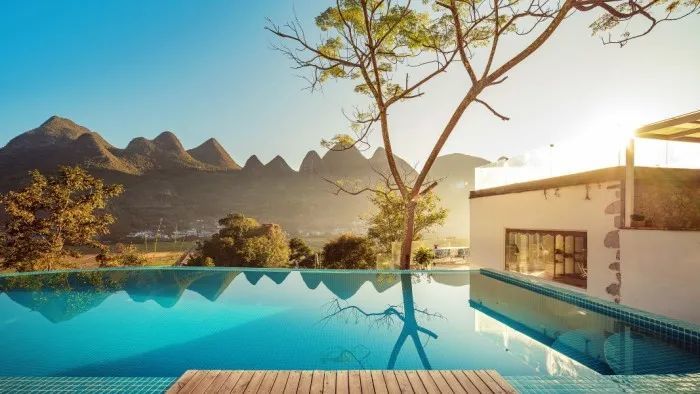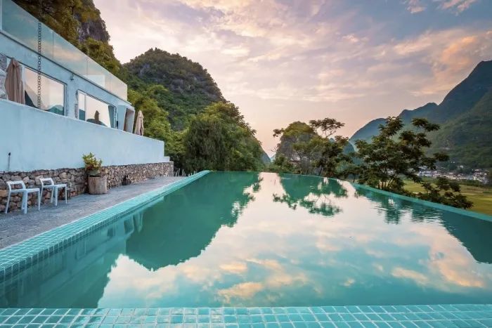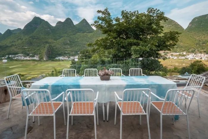 从小路进入民宿,最大的感受就是室外空间特别开阔,7个大露台专享悠闲时光,观景绝佳。另外,还有人见人爱的无边泳池,望出去,对面是带有万峰林特色的群山,蓝天白云下拍照非常出片。