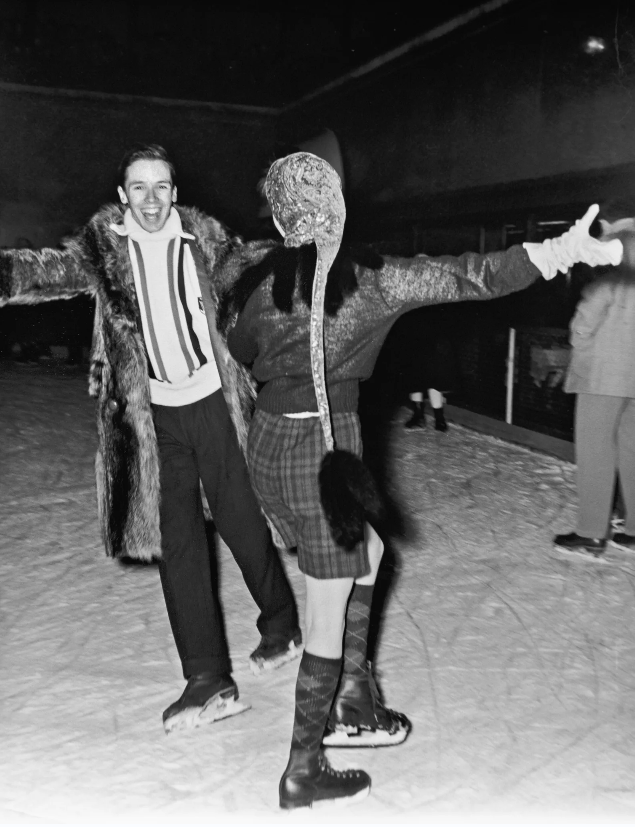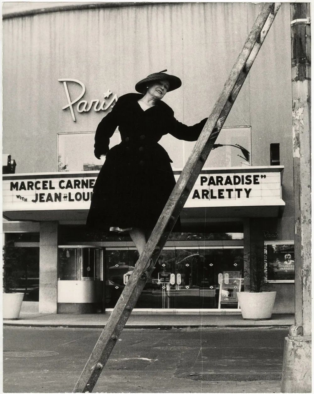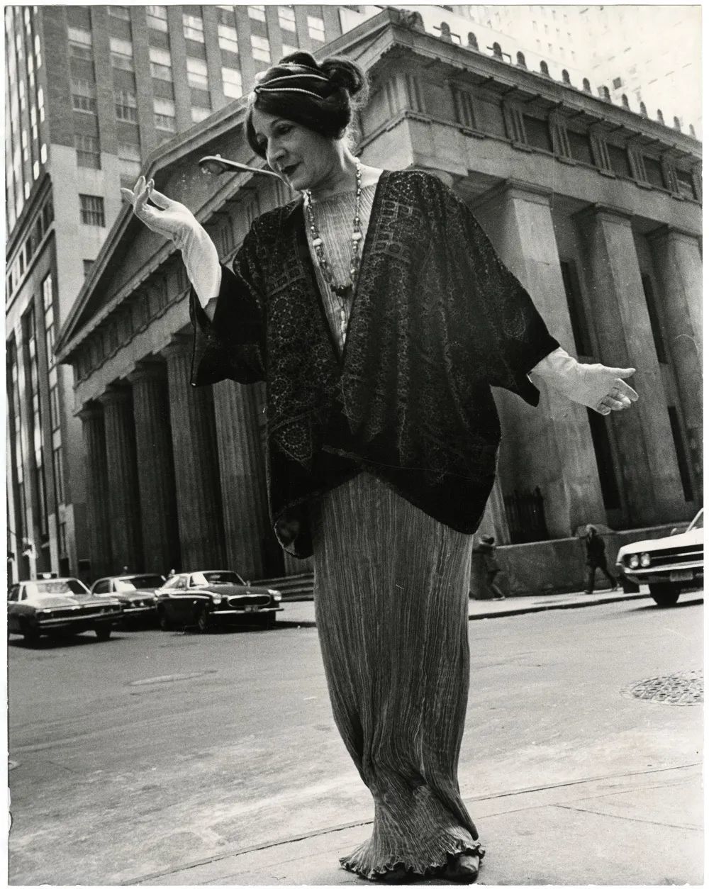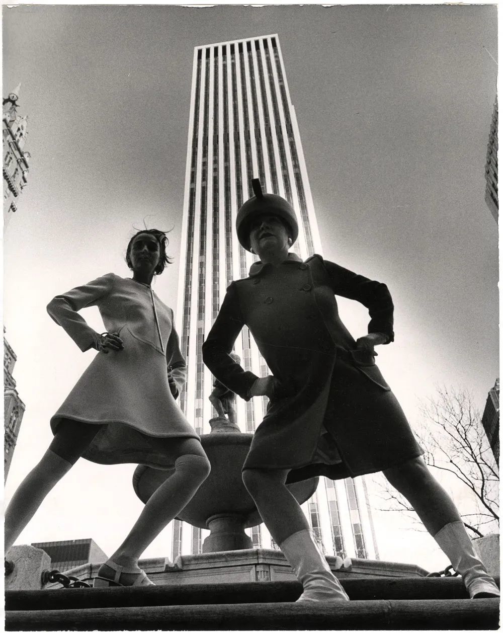 在大厦前做出怪异姿势的两个妇人,白色漆皮靴子搭配毛呢裙大衣,这身装扮放到今天也不过时。