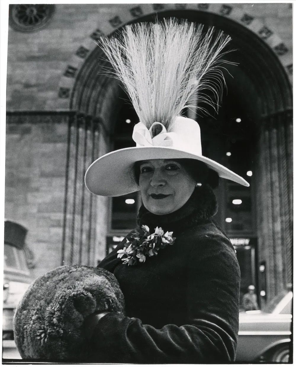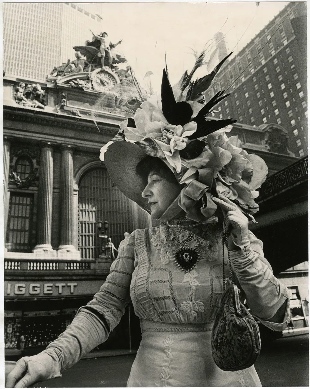 一名妇人,戴着插满各种羽毛的夸张礼帽,手提一个小巧的包裹,看起来像是中世纪的贵妇人,颇有些复古的情调。