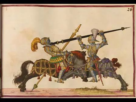 在酒桌饭局上,当喝得五迷三道的骑士们大着舌头开始争论谁为国王贡献多、谁在与异教徒的战斗中表现更勇猛、年轻貌美的有钱寡妇对谁最青睐等弱智问题的时候,难免会有人感觉自己的荣誉“受到了冒犯”。荣誉是骑士的第二生命,骑士必须用行动来捍卫它,简单地说就是得来一场决斗来洗刷耻辱。规则一般采用与司法决斗相类似的方式,但无需圈定范围。如果受到的侮辱极大,可以采用骑枪比武,即决斗双方手执骑枪,驱马对向冲锋,进入骑枪攻击范围时,先将对方击落的人为胜。在马匹全力冲刺下,长度近三米的骑枪击中骑士身躯,被击中的人会呈抛射状向后飞去,许久才能落地。如果双方同时落马,则要使用随身携带的剑和匕首决胜负。这种极具观赏性的决斗方式在当时备受王室成员和平民百姓的喜爱,每逢决斗都会有大批吃瓜群众围观叫好。