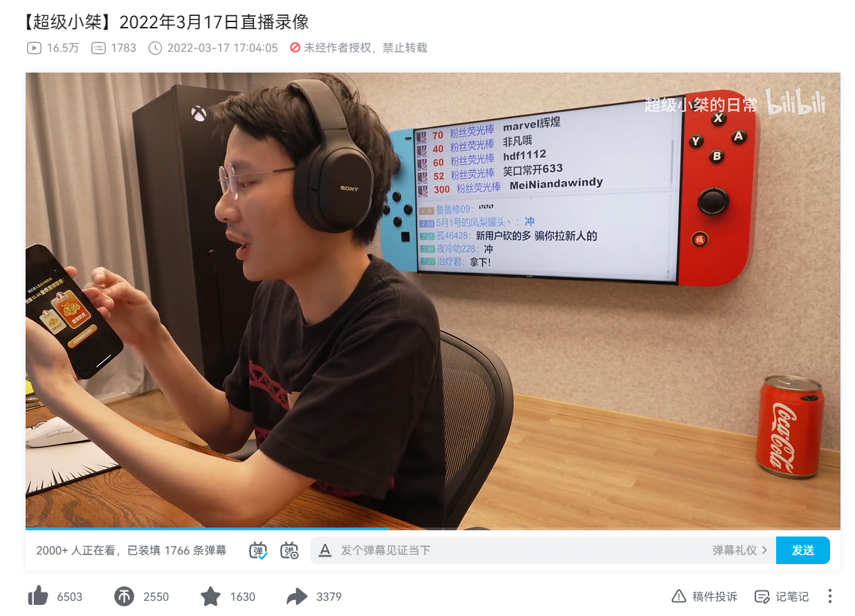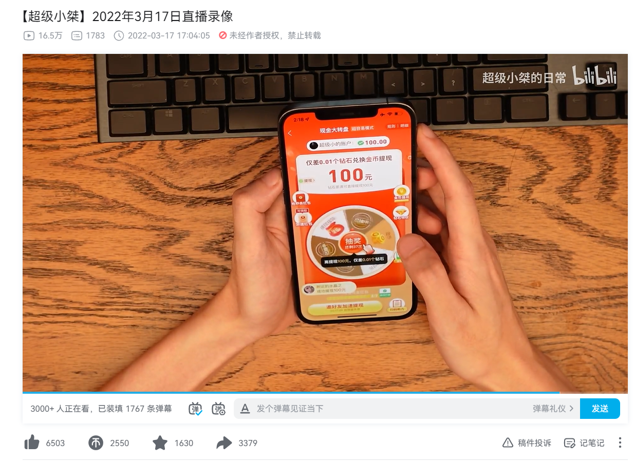从“超级小桀”在B站的直播录屏内容可以看到,主播发动了直播间的网友进行砍价,在几十分钟未能成功后,拨打了拼多多客服的电话,结果接通后沟通了几句就被挂断了。