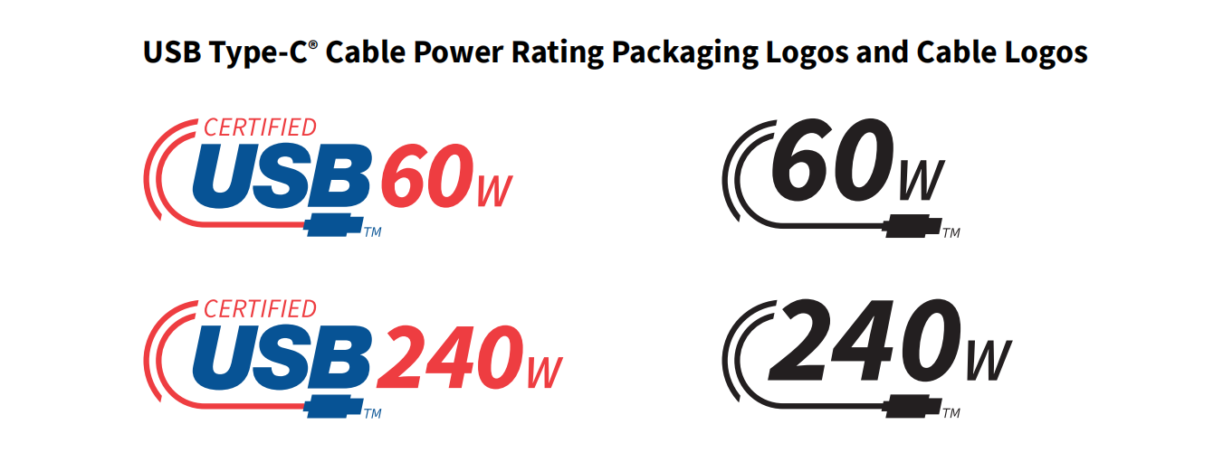 IT之家 3 月 19 日消息,据充电头网消息,USB-IF 协会现已正式公布了全新 USB-C 线缆额定功率 logo 使用指南。经过认证的 USB Type-C 线缆将支持 USB PD 3.1 规范定义的 60W 或 240W 功率。