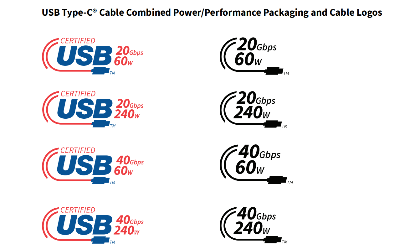 如上图所示,经过 USB-IF 认证的全新 USB-C 线缆将按照 20Gbps、40Gbps 的数据传输速度以及 60W、240W 充电速度进行分级,最高认证即为 USB 40Gbps / 240W,该标志将印在线缆的包装盒和线缆本体上。