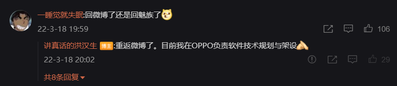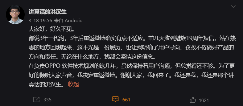 3 月 18 日,洪汉生的微博“讲真话的洪汉生”时隔近三年再次更新,表示已经在 OPPO 负责软件技术规划与架设,将回归微博倾听用户声音。