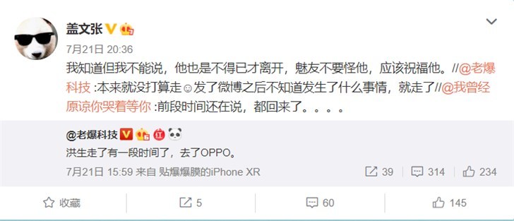 IT之家 3 月 20 日消息,2019 年,有消息称魅族工程师洪汉生已从魅族离职,去了 OPPO,随后这条消息被盖文张(前魅族科技总监)转发,称“我知道但我不能说,他也是不得已才离开,魅友不要怪他,应该祝福他。”
