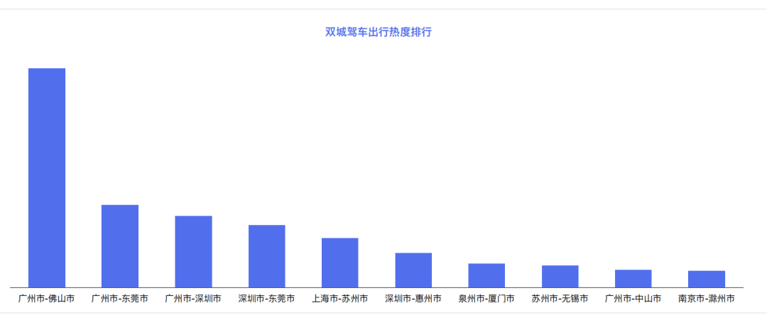全国双城驾⻋出⾏热度前十城市对依次为⼴州市-佛⼭市、⼴州市-东莞市、⼴州市-深圳市、深圳市-东莞市、上海市-苏州市、深圳市-惠州市、泉州市-厦门市、苏州市-无锡市、广州市-中山市、南京市-滁州市。