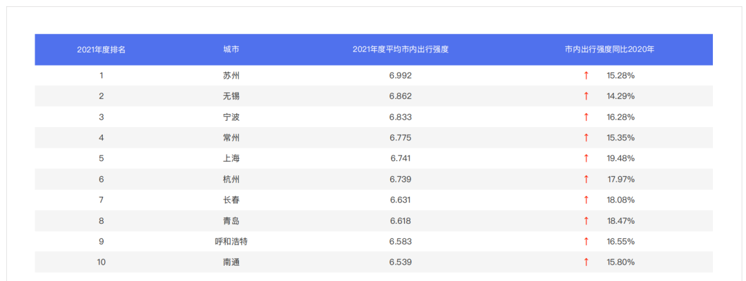 出行强度前十依次为苏州、⽆锡、宁波、常州、上海、杭州、长春、青岛、呼和浩特、南通。