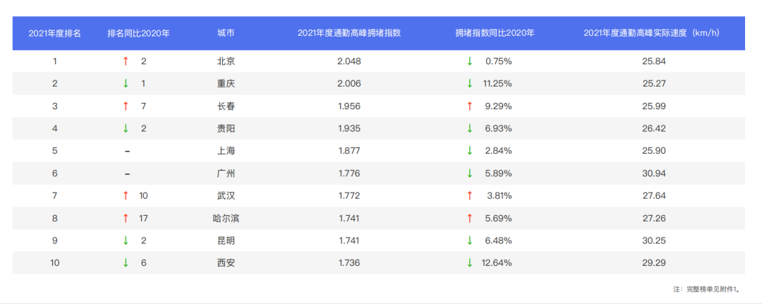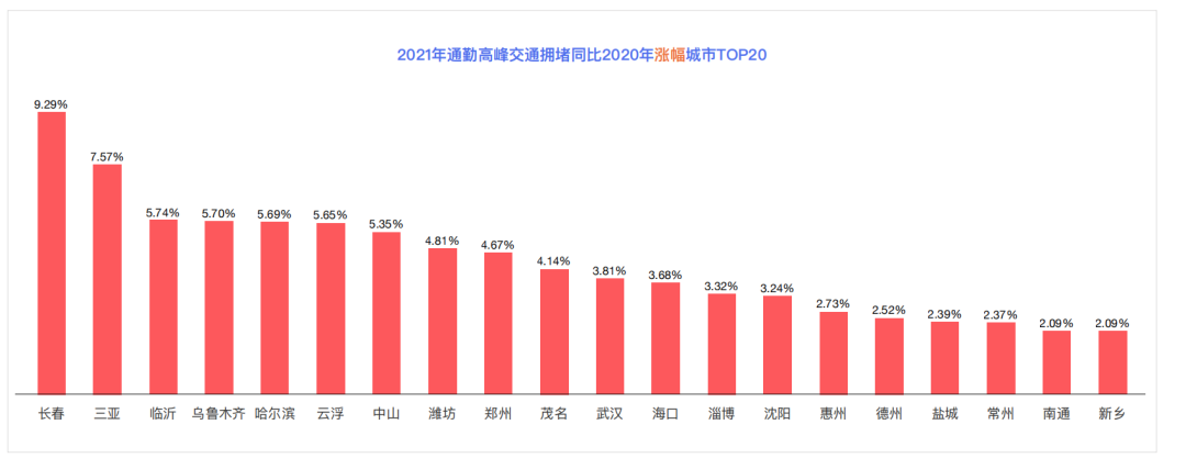 百城中34%的城市2021年度通勤高峰交通拥堵同比2020年上升。最高涨幅城市为长春,涨幅达到9.29%。·