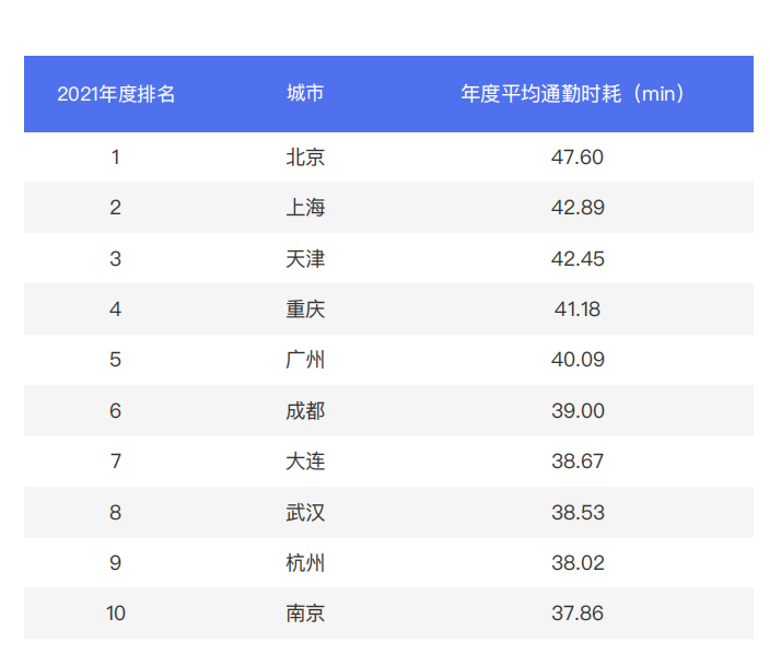 通勤时耗榜前十依次为北京、上海、天津、重庆、广州、成都、大连、武汉、杭州、南京。