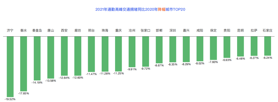 百城中66%的城市2021年度通勤⾼峰交通拥堵同⽐2020年下降。最⾼降幅城市为济宁,降幅达到19.52%。