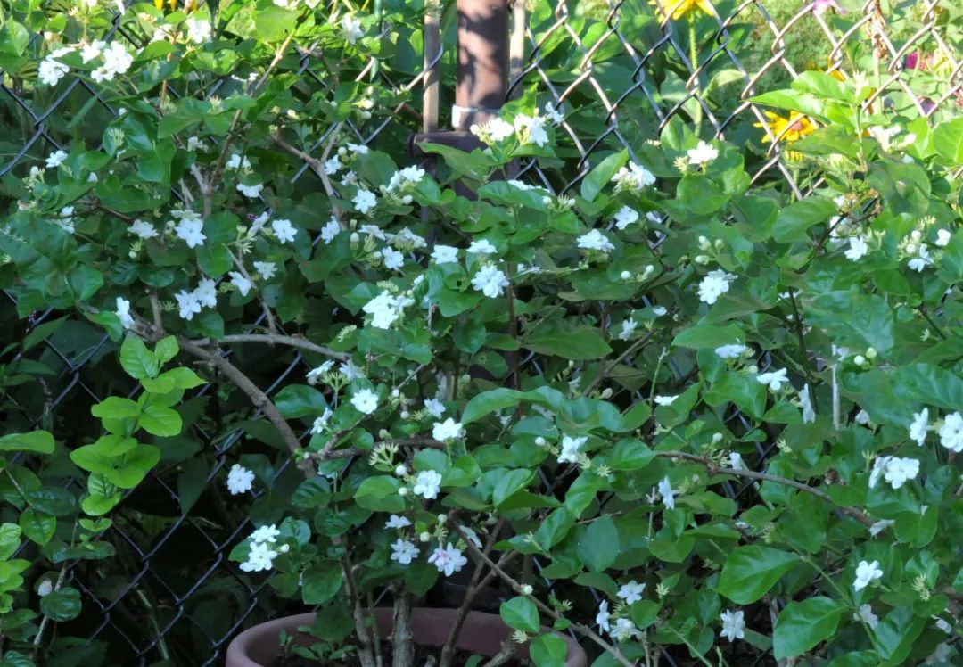 养茉莉花和养月季花是有很多共通之处的,就是如果不修剪,花朵会越来越少,而且植株的形态会越来越散乱,会有很多小分枝低垂下来。