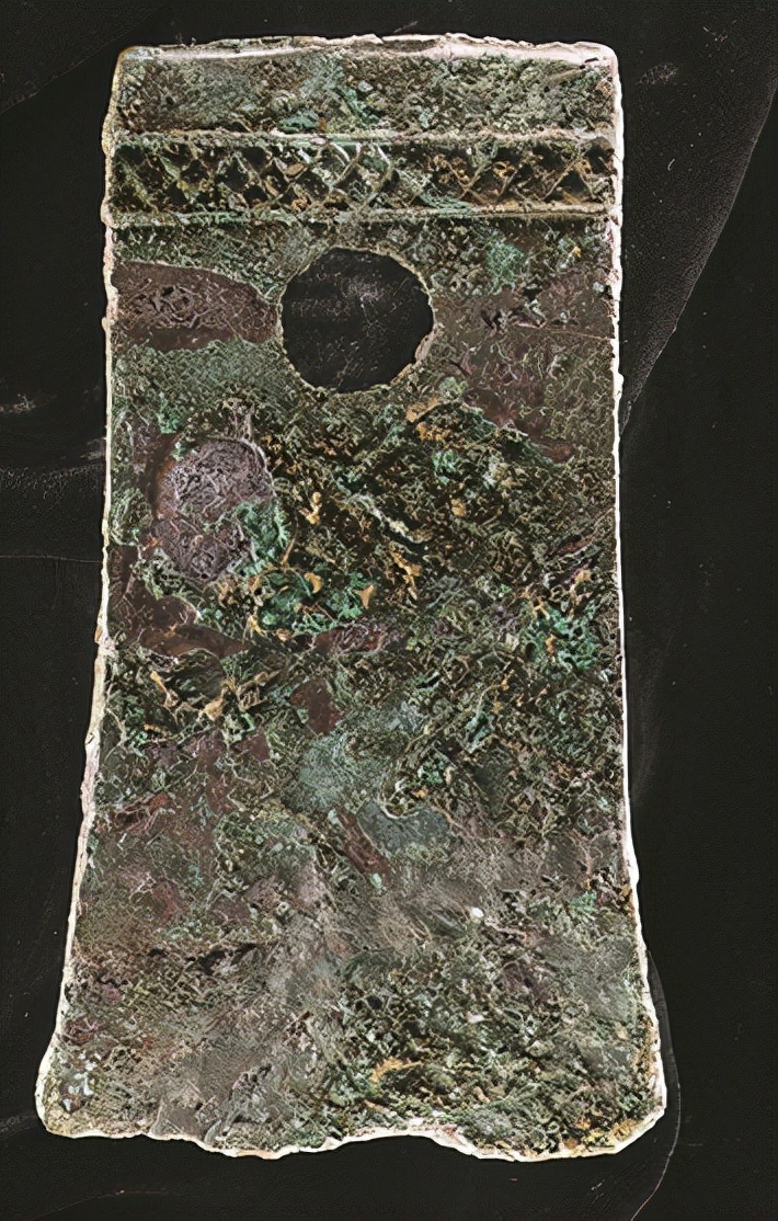 就拿图里左边的这只铜钺来说、铜钺顶部铸有四排精美整齐的方格纹,而方格纹内部还有凸起。这种纹样被称为乳钉纹。按照专家的话来说,目前在二里头遗址都没有发现这样精美的铜钺。这种工艺在当时,不是普通人能用的起的。而且这个遗址很小,不像高级聚落,所以一次发现那么多青铜器,是很让人意外的。