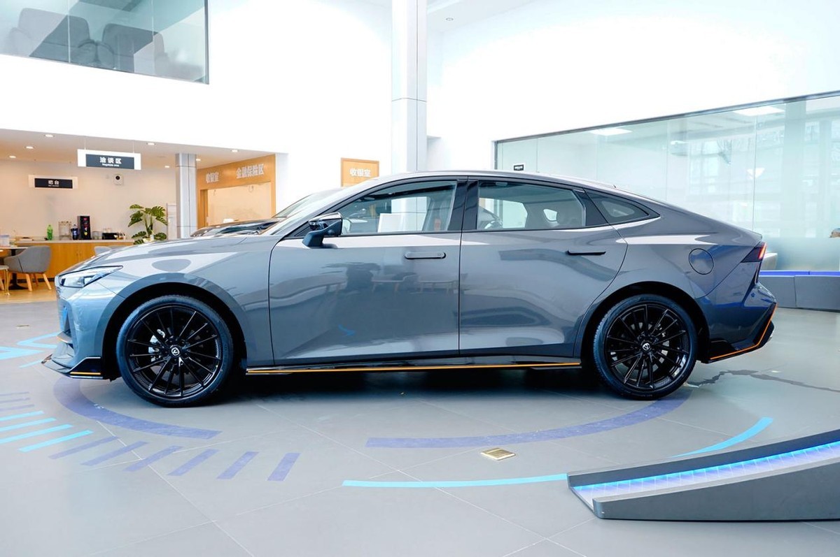 侧面造型做得很漂亮,车身整体低趴、车顶采用大溜背造型,前悬短后悬长、车尾向内收,带出奥迪A7的神韵。硬朗的腰线与尾窗衔接,顺势带出内收的车肩,与整车空气动力学造型匹配。侧裙部分了橙色饰条,与车头、车尾呼应。