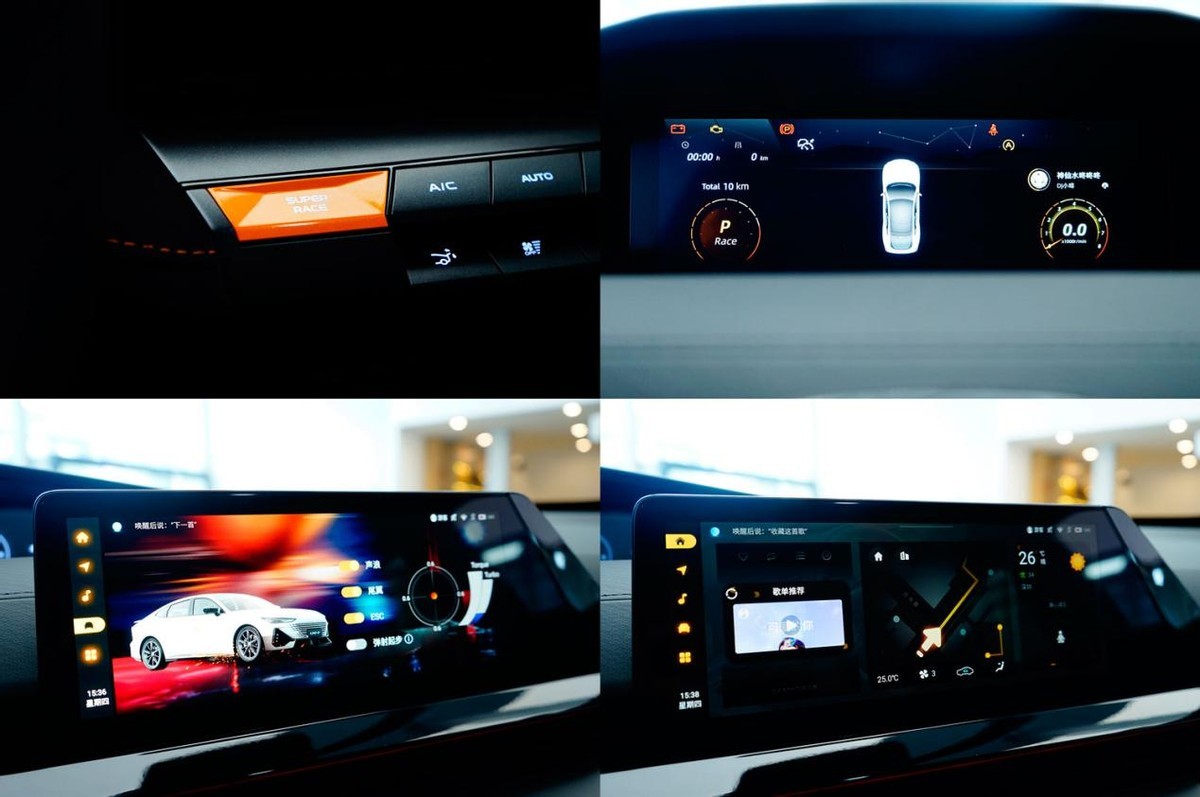 除了常规的舒适、经济和运动三种驾驶模式,还提供“SMART”智能模式和“SUPER RACE”赛道模式。赛道模式开启后尾翼会自动升起,并且超增压控制和弹射起步功能也随之就位,运动排气也可以同步打开,中控屏和仪表盘也会改为专属的赛道UI界面,氛围灯效也同步变化,感官上的刺激非常到位。