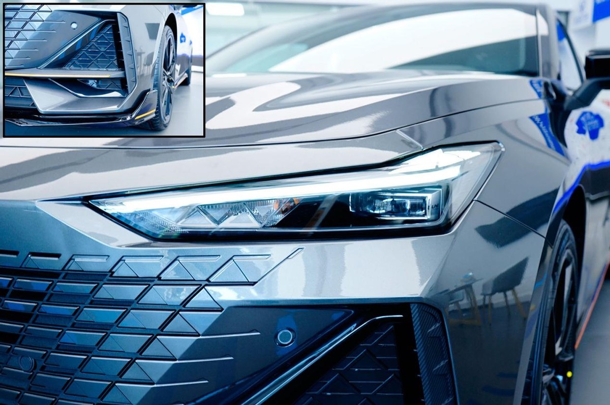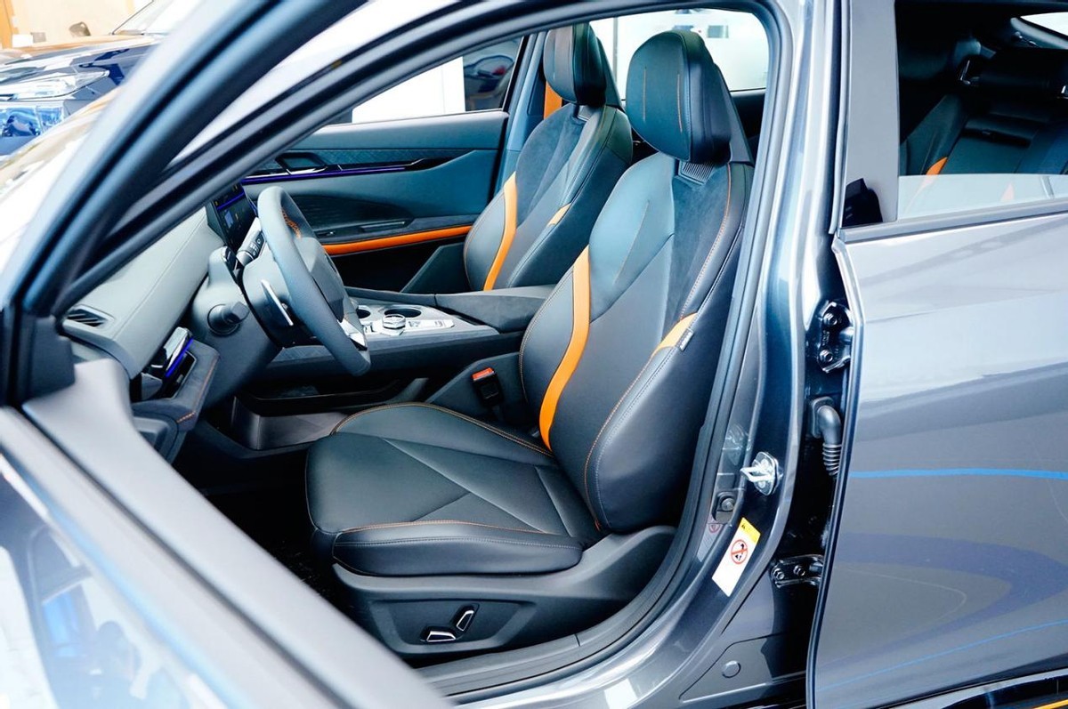 前脸延续了家族风格,标志性无边界格栅看起来有蒙面般的神秘感,由三角形+梯形组成的内部结构很密集但丝毫不显杂乱。扁平化的LOGO从前脸上移至车头,和大牌超跑有相同的调性。格栅被立体橙色饰条分为两段,中央弯折部分内置毫米波雷达模块,立体的前唇也让车头看起来更有视觉冲击力。