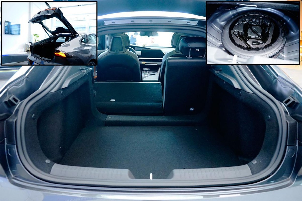 采用掀背式尾门,开口面积很大,进出大件物品便利,而且提供了带记忆和感应的电动尾门。尾厢的纵深还不错,地板下沉比较深、用来拓展垂直高度,但前高后低的空间决定了它很难放置大件方正物品。好在后排座椅支持4:6分割放倒,平整度不算高,但能解决一些实际问题。地板下方配备了非全尺寸备胎和维修应急工具。