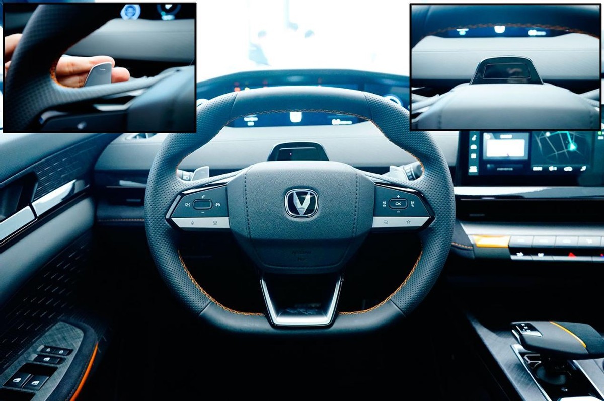 车厢布局也是家族风格,IMS智能交互座舱采用四块屏为人机交互通道,远置的仪表盘由三块屏幕组合而成,显得很细长,便于观看,而近置的中控屏触控起来也很方便,这就需要一块纵深足够的中控台,同时高度做得很薄。当然,方向盘的造型看起来就有些古怪了,上下平底可以接受,但上下不对称看起来就不太舒服了。