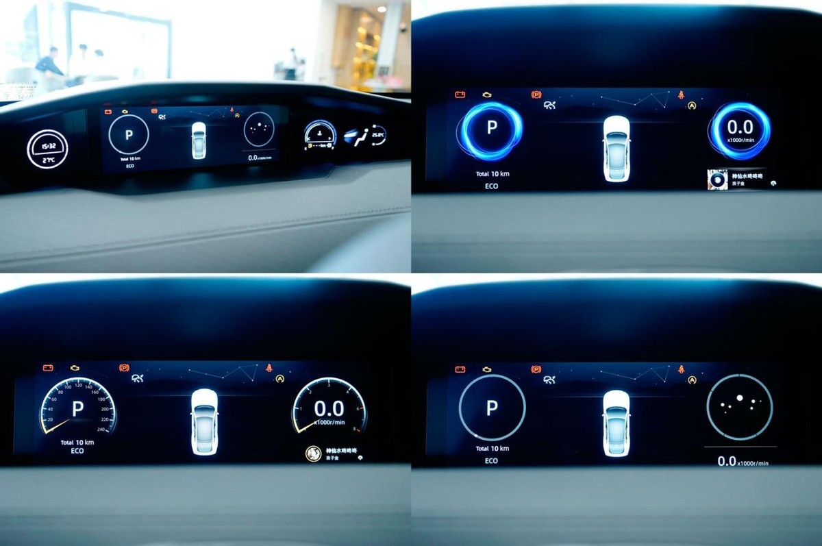 这是顶部细长的仪表盘,由三块屏幕组合而成,中央是标配的10.3英寸液晶仪表,UI界面为深色底浅色画面,看起来很清晰,提供经典、运动、简约三套主题。左侧小屏幕显示时钟和温度,右侧小屏幕显示油量和空调信息。