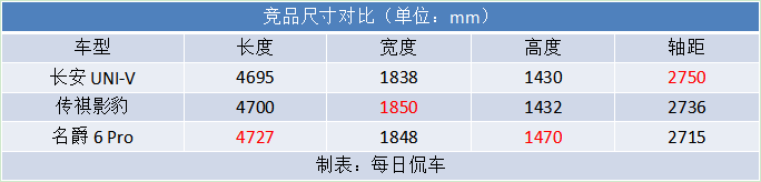 车身尺寸长宽高分别为4695/1838/1430mm,轴距为2750mm。与对手相比,UNI-V轴距更长、车身却更短,高度也是最低,在运动姿态上做得更极致一些。