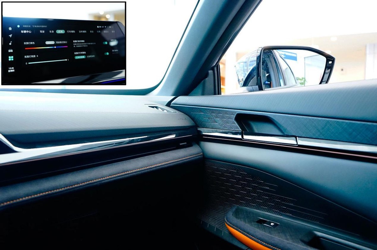车厢用料也不错,顶部是软质塑胶,门板上有大面积皮质覆盖,这台运动版前方台面也加入了翻毛皮装饰,看起来更有味道。除入门车型,都配备64色车内氛围灯,夜晚的视觉效果也很丰富。