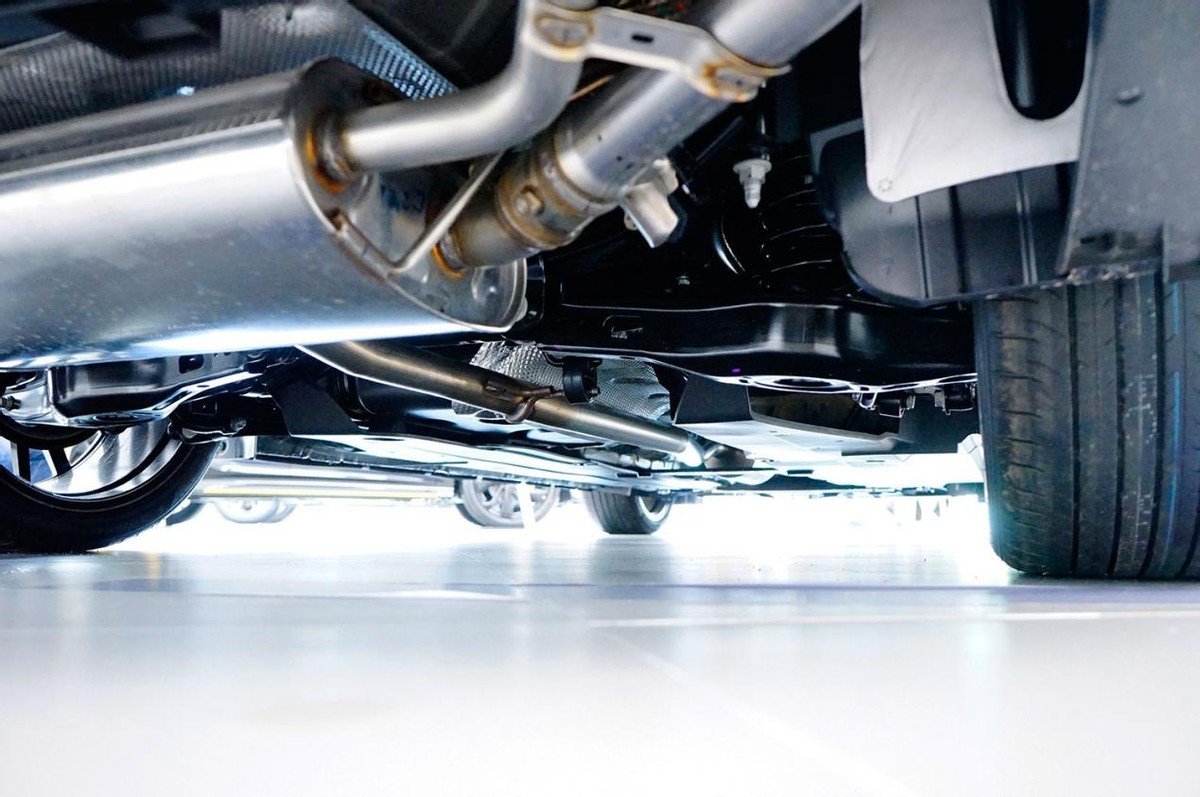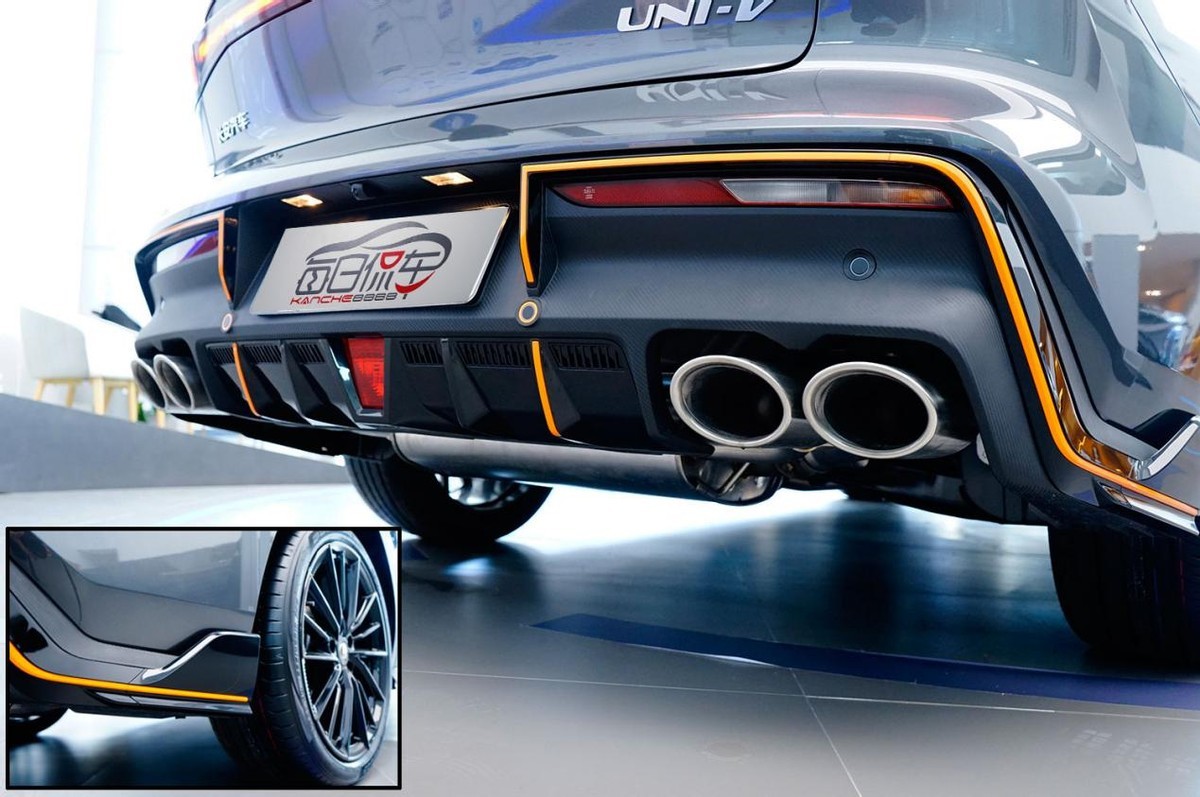 黑色的保险杠被橙色饰条分为三个区域,车身外侧增加了亮黑色风刀,中央是密集的扩散器造型并中置雾灯,运动版采用双边同四出排气管,并加入了可变阀门的运动排气,这种赛车化的装饰风格视觉上比较炸裂,年轻朋友估计很难抵挡住诱惑吧。